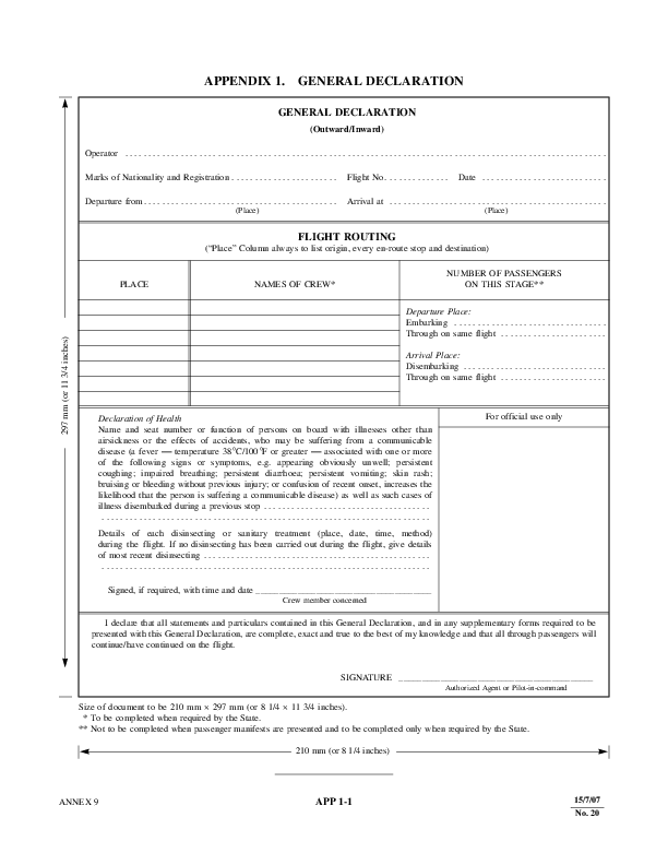ICAO General Declaration form with Declaration of Health variation