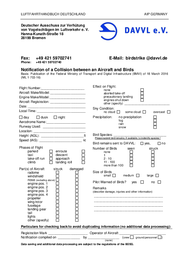 German Bird Strike Report Form
