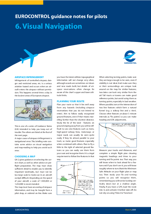 This is the sixth of a series of Guidance Notes (GN) intended to help GA pilots avoid infringement of controlled airspace. The key points of GN 6 are Choosing a map, Planning Your Route, Flying the Route, In-Flight Navigation, Uncertain of Position and Crossing Airways.