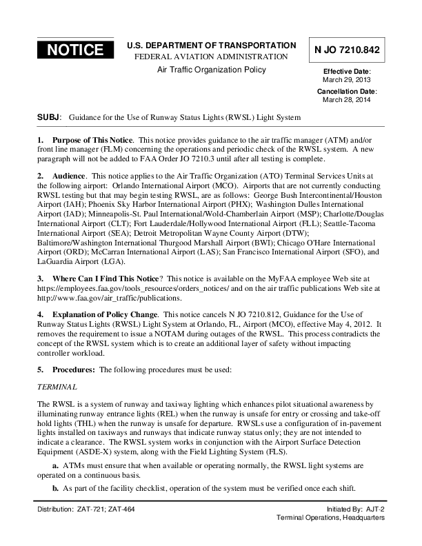 Guidance for the Use of Runway Status Lights (RWSL) Light System - FAA Air Traffic Organization Policy Notice N JO 7210.842 issued 29 March 2013 and valid for 12 months