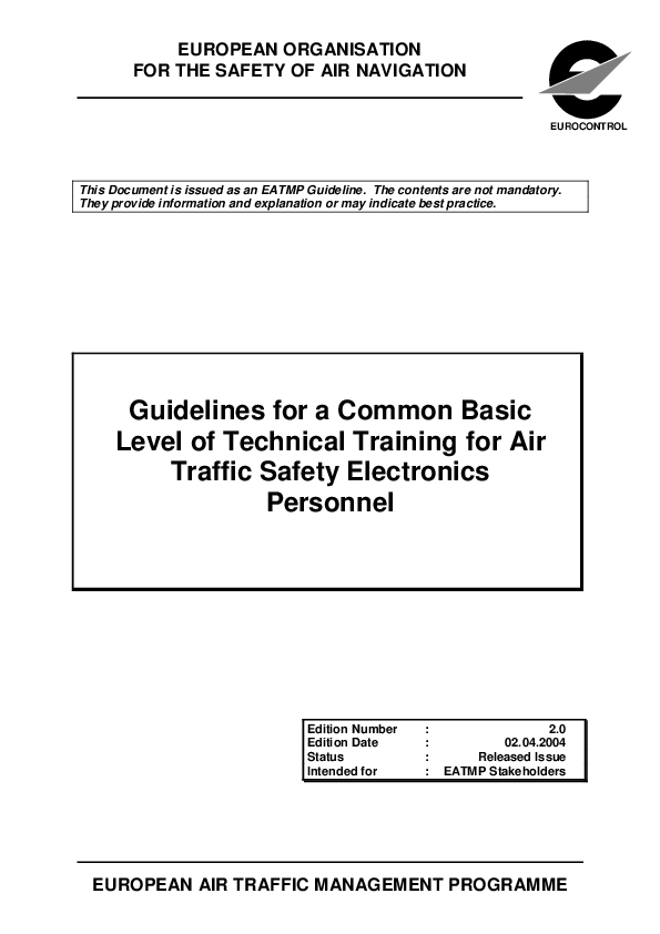 This document enables the creation of a basic training for Air Traffic Safety Electronics Personnel (ATSEP). The purpose is to start harmonisation of ATSEP training throughout the European Civil Aviation Conference (ECAC) area within the frame of the European Air Traffic Management Programme (EATMP), known simply as ‘European Air Traffic Management (EATM)’ since May 2003.