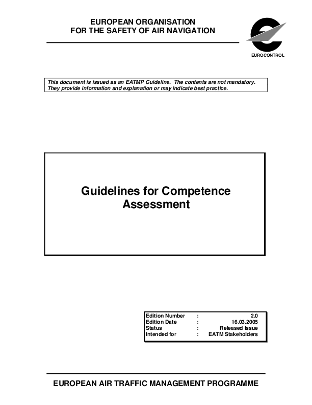 The ATCO Licensing Review Task Force (ALRTF) set up by the EATM Human Resources Team (HRT) developed this document as guidance for ECAC Member States introducing a competence assessment scheme. The first edition of the document outlined the process for developing a competence assessment scheme from the selection of competence assessors, to the conduct of competence assessments to record keeping. This 2nd edition of Guidelines for Competence Assessment provides a more comprehensive analysis of the subject by offering guidelines for the development of performance objectives and additionally includes guidance for the competence assessment of On-the-Job-Training Instructors (OJTIs) and Competence Assessors.