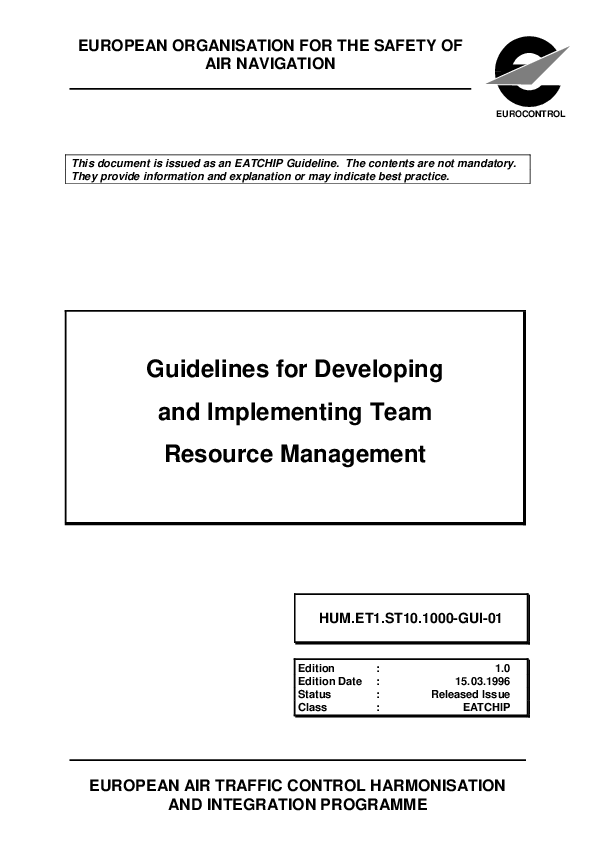 These guidelines reflect the work of the Team Resource Management (TRM) Task Force of the EATCHIP Human Resources Domain and provide management and operational staff with relevant information when considering the development and implementation of TRM. An example of an outlined syllabus for TRM training which can be used by training designers as a basis for developing courses is also provided.