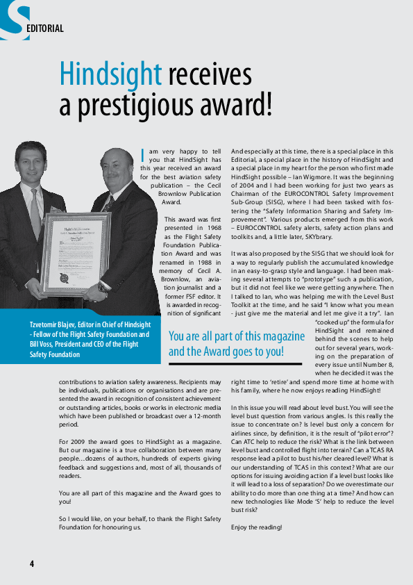 The Flight Safety Foundation award the Cecil Brownlow Publication Award to Hindsight