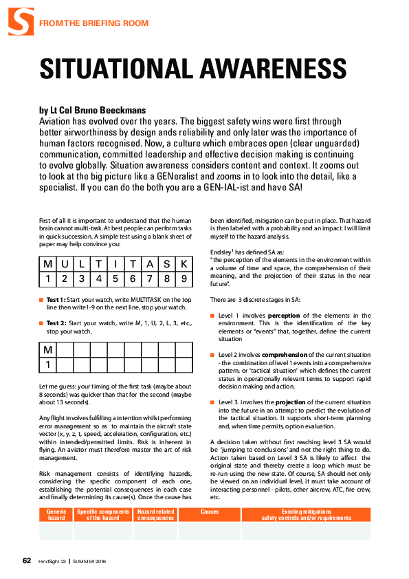Article from HindSight 23 focused on situational awareness
