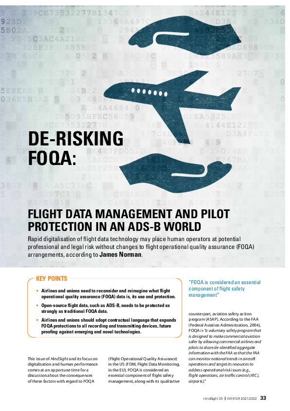 Hindsight 33 - De-risking FOQA: Flight data management and pilot protection in an ADS-B world