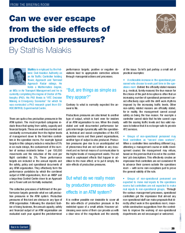 The processes of fulfilment of performance targets generate production pressures in the ATM system. The annual capacity, safety and financial output of an ATM organisation are evaluated each year against the predetermined performance targets; positive or negative deviations lead to appropriate corrective actions through managerial actions and processes. But things are not as simple as they appear!