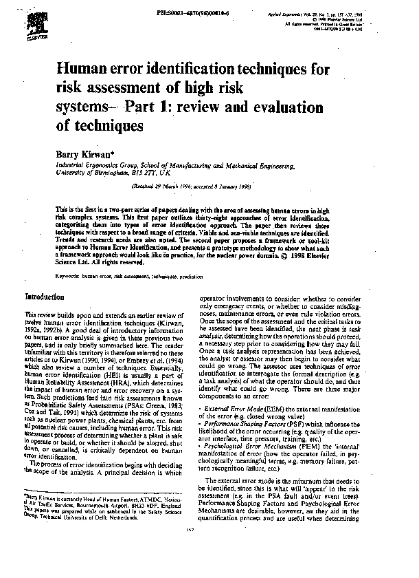 Human error identification techniques for risk assessment of high risk systems Part 1