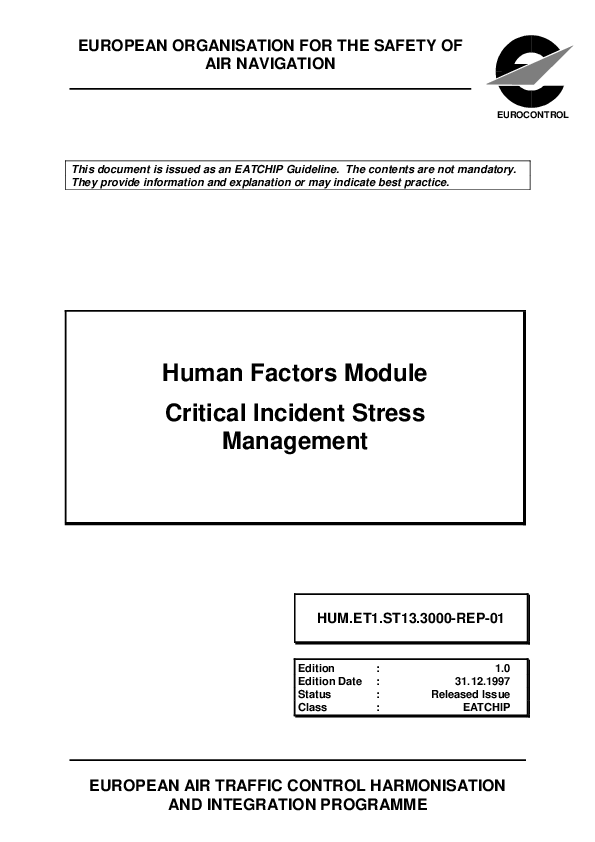 The EATCHIP Human Resources Domain is developing several human factors modules that deal with the management of human performance. This module is about critical incident stress management (CISM). The aim of this module is to present the reader with a concept for CISM and guidelines for implementation.