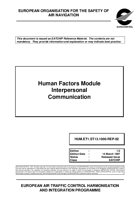 This document is, within the Human Resources Domain, one of the Human Factors Modules. These modules deal with Human Performance. This module explains the complexity of interpersonal communication. It describes process and functions of interpersonal communications and introduces the reader to the influences of typical human factors on verbal and non-verbal human communication. Aviation communication is in many aspects influenced by these human factors.