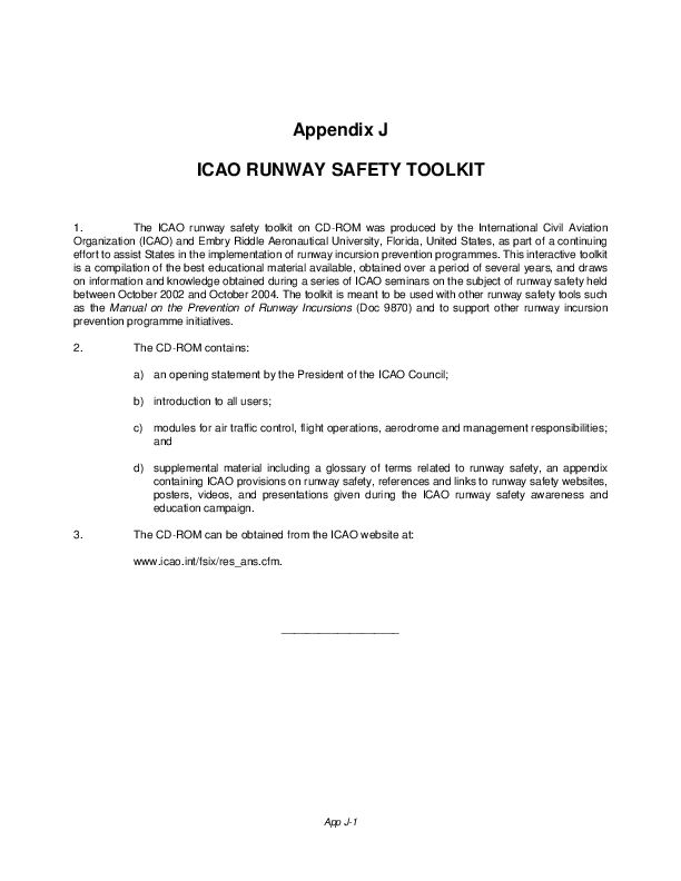 ICAO Doc 9870 - Manual on the Prevention of Runway Incursions: Appendix J - ICAO Runway Safety Toolkit