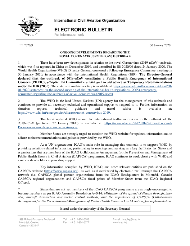 ICAO Electronic Bulletin: Ongoing Developments Regarding the Novel Coronavirus (2019-nCoV) Outbreak