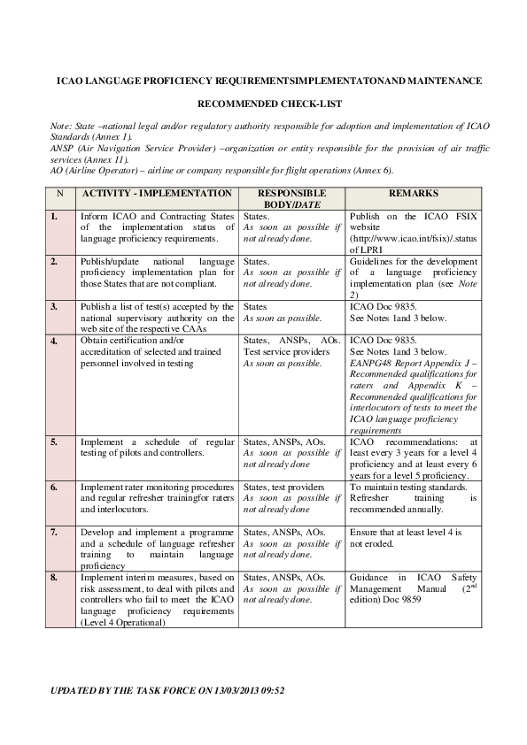 ICAO Language proficiency requirements - Implementation and maintenance recommended check-list updated on 13/03/2013