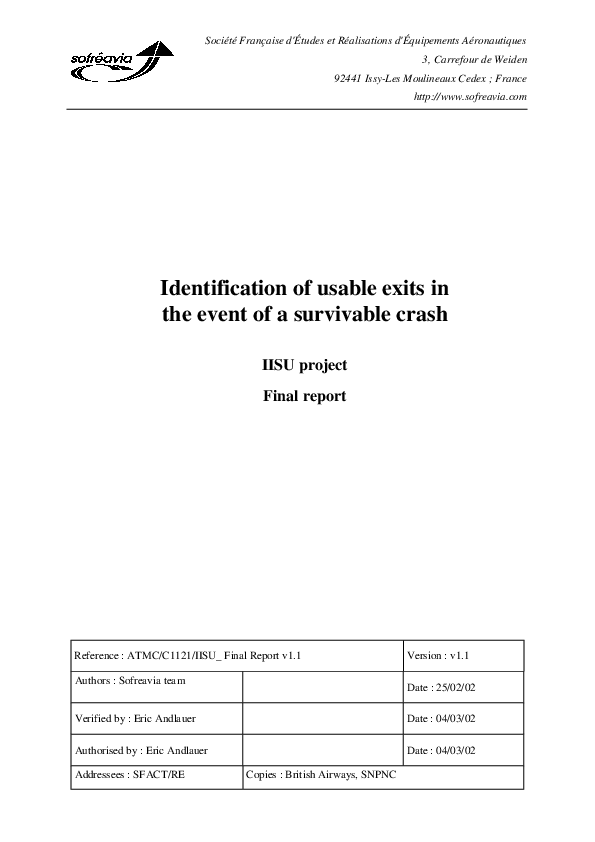 This study by Sofreavia for JAA analyses the potential improvements in terms of assistance for aircraft occupants in identifying the usable exits and for PNC in guiding the passengers.