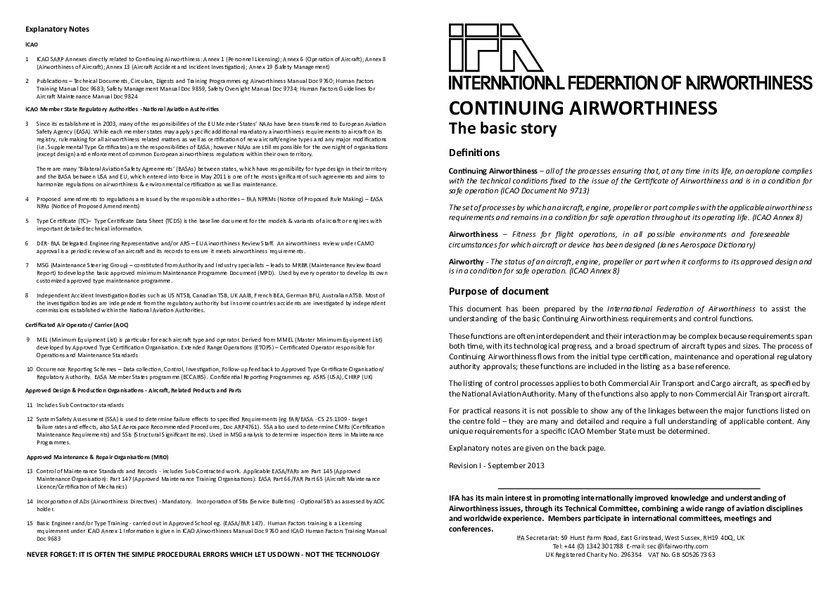A document prepared by the International Federation of Airworthiness to assist the understanding of the basic Continuing Airworthiness requirements and control functions.