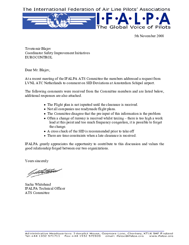 At a meeting of the IFALPA ATS Committee, in November 2008, the members addressed a request from LVNL ATC Netherlands to comment on SID Deviations at Amsterdam Schipol airport. This letter to EUROCONTROL is the IFALPA formal response.