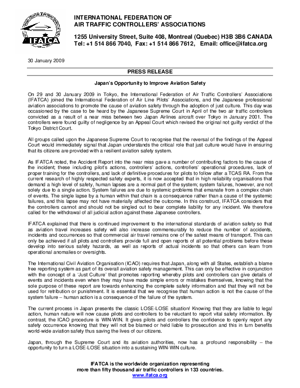 IFTCA - Press Release 090130: Japan's Opportunity to Improve Aviation Safety