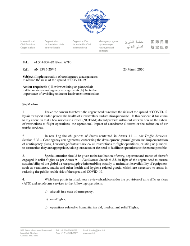 ICAO State letter on the implementation of contingency arrangements to reduce the risks of the spread of COVID-19.