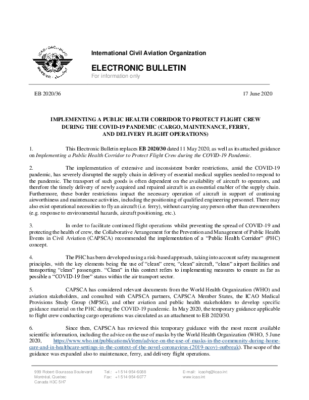 In order to facilitate continued flight operations whilst preventing the spread of COVID-19 and protecting the health of crew, (CAPSCA) recommended the implementation of a “Public Health Corridor (PHC) concept.