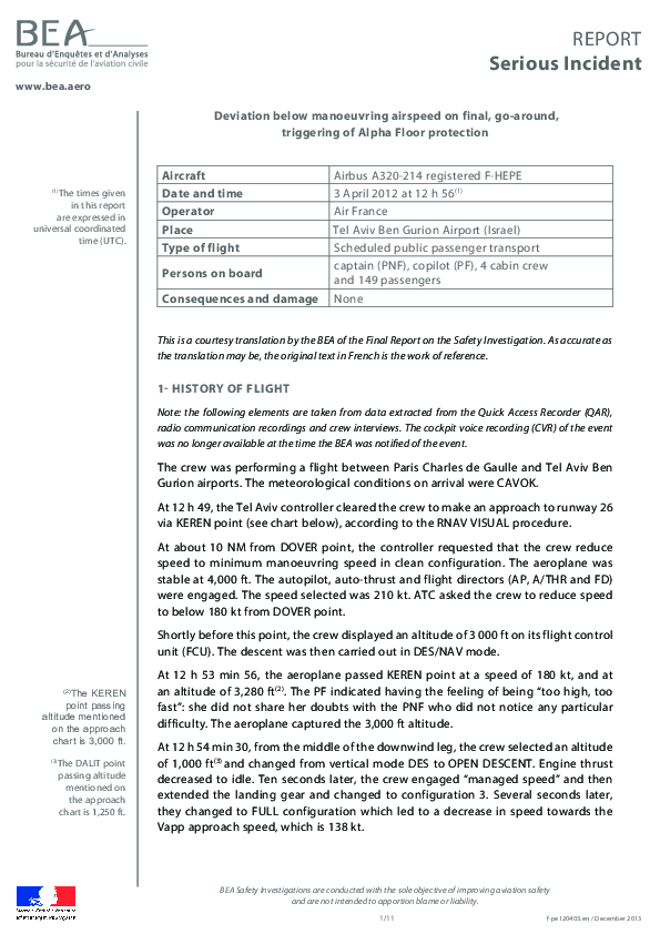 On 3 April 2012, the crew of an Air France Airbus A320 came close to loosing control of their aircraft after accepting, inadequately preparing for and comprehensively mismanaging it during an RNAV VISUAL approach at Tel Aviv and during the subsequent attempt at a missed approach. The Investigation identified significant issues with crew understanding of automation - especially in respect of both the use of FMS modes and operations with the AP off but the A/T on - and highlighted the inadequate provision by the aircraft operator of both procedures and pilot training for this type of approach.