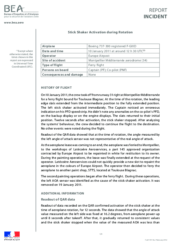 On 10 January 2011, a Boeing 737-300 being operated by Europe Airpost on a positioning flight from Montpelier to Toulouse with only the flight crew on board had just rotated for take off on runway 31R in day VMC when the leading edge slats extended from the Intermediate position to the Fully Extended position and the left stick shaker was activated. Initial climb proceeded and shortly afterwards, the slats returned to their previous position and the stick shaker activation stopped. It was decided to continue the planned flight which was uneventful thereafter.