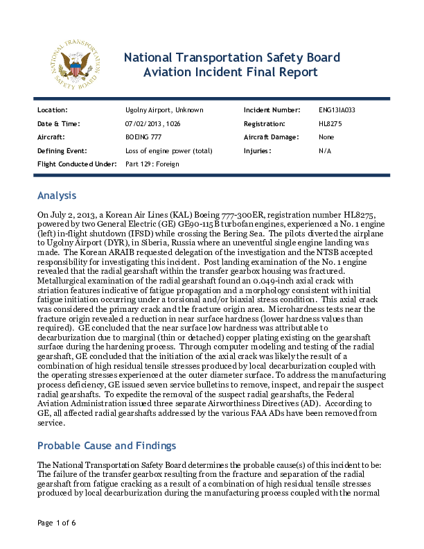 On 2 July 2013, a Korean Air Lines Boeing 777-300 experienced an uncommanded in-flight shutdown of one of its GE90-115B engines while crossing the Bering Sea. The crew made an uneventful diversion to Anadyr Russia. The Korean Aviation and Railway Accident Investigation Board (ARAIB) delegated investigative duties of this event to the National Transportation Safety Board (NTSB) which identified the cause of the failure as a manufacturing process deficiency which could affect nearly 200 similar engines.