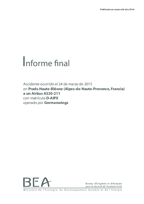 Informe final Accidente ocurrido el 24 de marzo de 2015 en Prads-Haute-Bl one (Alpes-de-Haute-Provence, Francia) a un Airbus A320-211 con matrÃÂcula D-AIPX operado por Germanwings.