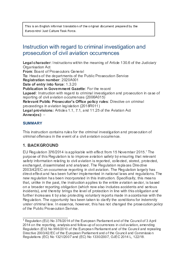 Instruction with Regard to Criminal Investigation and Prosecution of Civil Aviation Occurrences