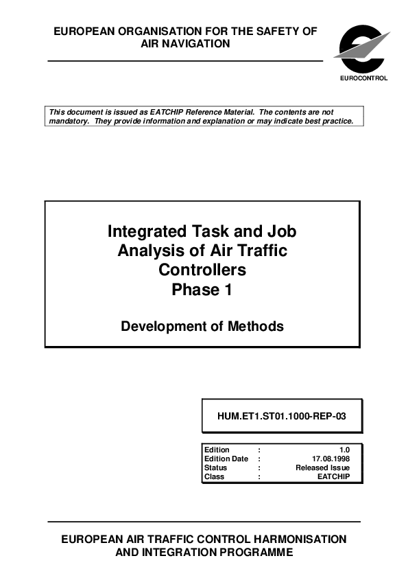 The development and the elements of a standardised Integrated Task Analysis (ITA) procedures are described. The main purpose of this task analysis is to describe the job and tasks of Air Traffic Controllers (ATCOs) from a perspective which focuses on the cognitive processes. Its main aim is to throw some light on the processes which take place in the controller's mind while he is working. For this purpose a cognitive interview has been developed, which addresses the controller's information processing for different tasks. The interview is supplemented by a set of observational methods. A flight-progress reconstruction interview links the results of the interview to those of the more classical task observation. To complete the methods, an interview addressing organisational aspects and some methods for assessing the controller's workload and stress are provided.