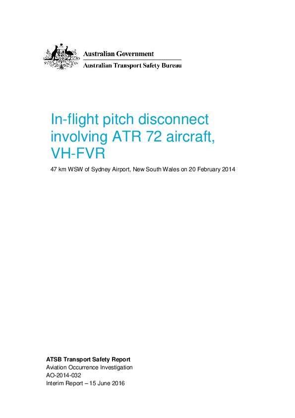Interim Report In-flight pitch disconnect ATR 72 aircraft, VH-FVR, WSW of Sydney Airport, 20/02/14