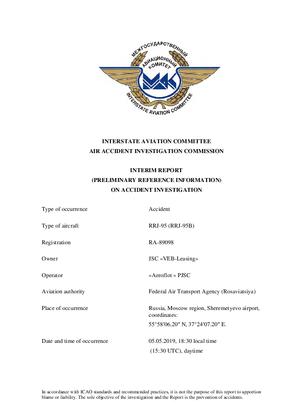 Interim Report SU95 (RA-89098), Moscow Sheremetyevo Russia, 5 May 2019