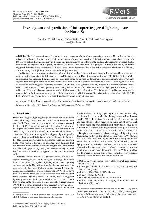 In this study, previous work on triggered lightning is reviewed and case studies are examined in order to identify common meteorological conditions for helicopter-triggered lightning strikes. Using forecast data from the Met Office Unified Model, an algorithm for triggered lightning risk was produced based on outside air temperature and precipitation rate. Evaluation against past helicopter strike cases has demonstrated that the new algorithm successfully forecasts lightning risk on 80% of occasions when triggered lightning occurred. In addition, the algorithm correctly forecast 8/9 natural lightning strikes which were observed in the operating area during winter 2010–2011. The areas of risk highlighted are usually small, which should allow helicopter operators to plan flights around high risk regions. The information in this study can also be used to inform helicopter operators of the likely conditions in which triggered lightning strikes occur.