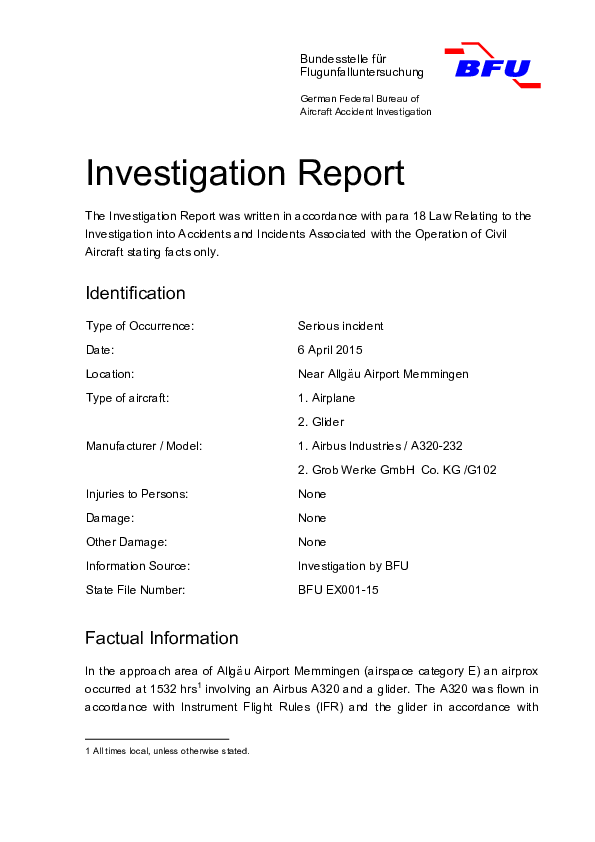 Investigation Report BFU EX001-15 A320 / GLID vicinity Memmingen Germany 2015 LOS