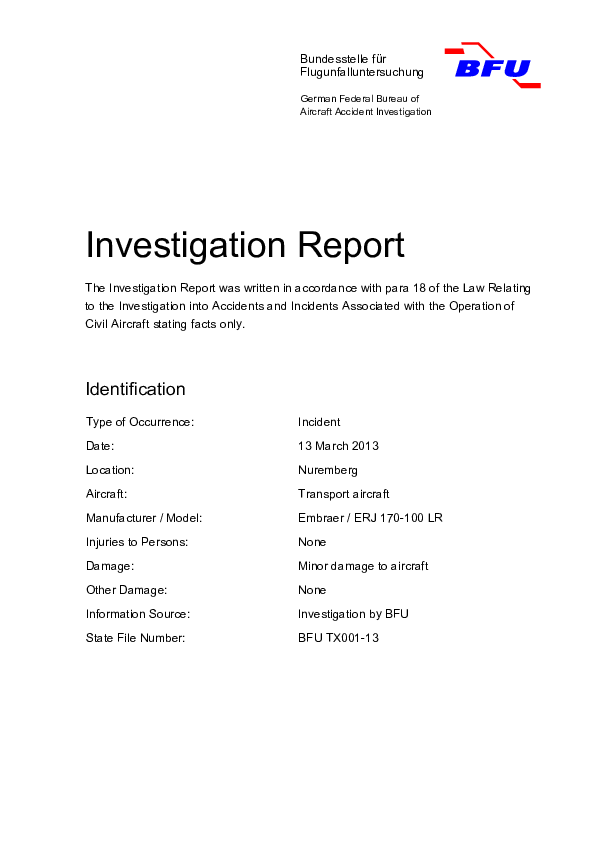 Investigation Report BFU TX001-13 E170 Nuremberg Germany 2013