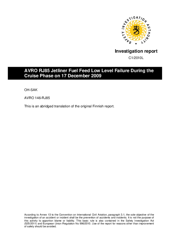 Investigation Report C1/2010L - RJ85 fuel starvation due icing in fuel system, Finland, 17 Dec 2009
