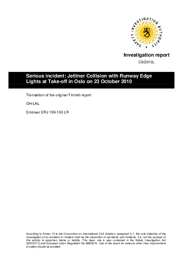 Investigation report C9/2010L E190 Collision with Runway Edge Lights at Take-off Oslo 23 Oct 2010