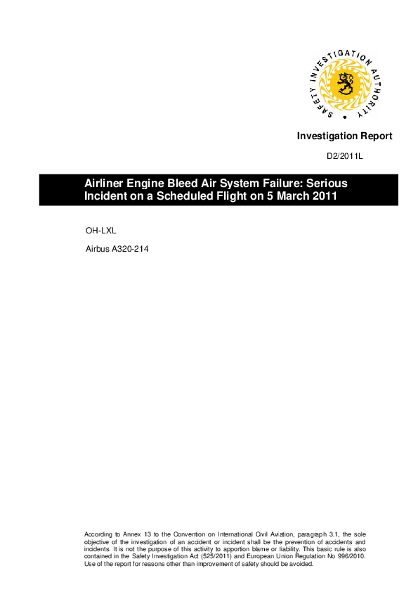 Investigation Report D2/2011L, A320 emergency descent due dual failure of the bleed air system, Olan