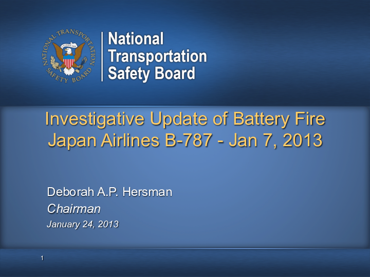 Investigative Update of Battery Fire Japan Airlines B-787 NTSB January 2013