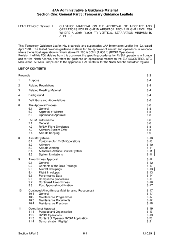 The leaflet provides guidance material for the approval of aircraft and operations in airspace where the vertical separation minimum above FL 290 is 300m (1,000 ft) (RVSM Operations).