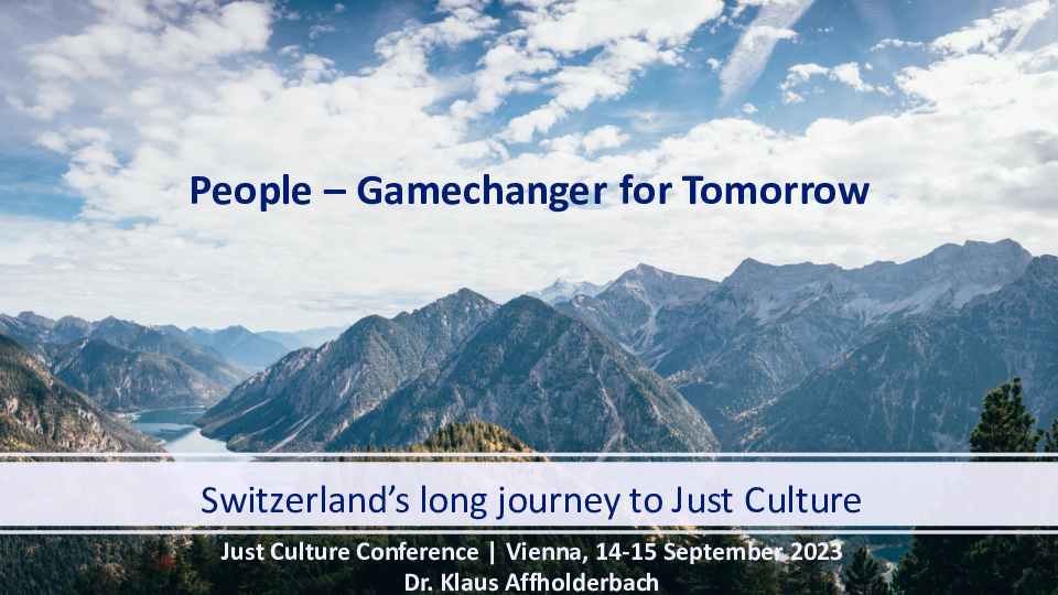 Keynote address: People – Game changer for tomorrow – Switzerland’s long journey to just culture, presented on 14 September 2023 as part of the 2023 Just Culture conference titled "Just Culture & the Judiciary - Exploring Safety for all in a Culture of Justice".