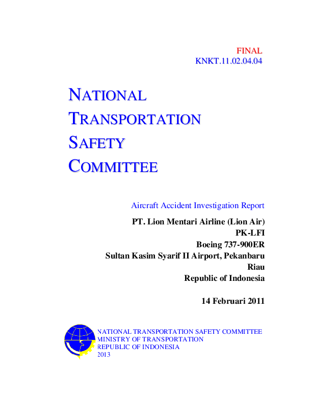 KNKT.11.02.04.04, B739 runway excursion, Pekanbaru Indonesia, 14 Feb 2011