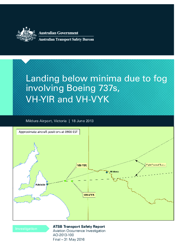 On 18 June 2013, two Boeing 737 aircraft, VH-YIR operated by Virgin Australia Airlines Pty. Ltd. as Velocity 1384 and VH-VYK operated by Qantas Airways Ltd. as Qantas 735, were on scheduled flights to Adelaide, South Australia. On nearing Adelaide, the forecast improvement in weather conditions had not occurred and as a result, both aircraft commenced a diversion to Mildura, Victoria. Upon arrival at Mildura, the actual weather conditions were significantly different to those forecast, in particular with visibility reduced in fog. The flight crew of Qantas 735 conducted an instrument approach and landed below minima. The flight crew of Velocity 1384 also conducted an instrument approach and landed below minima in fog and with fuel below the fixed reserve.