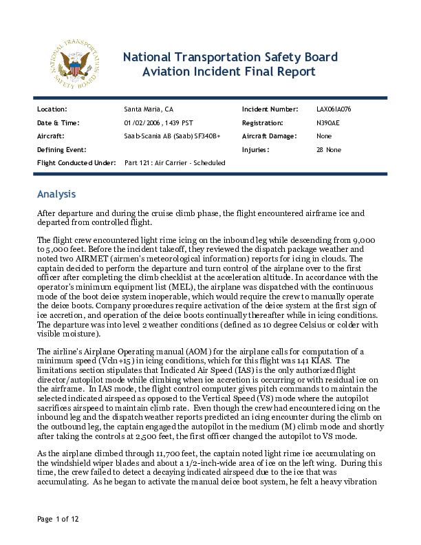 On 2 January 2006, a Saab SF340B, experienced loss of control over Santa Maria, California during climb due to airframe ice accretion following inappropriate operation of the aircraft with respect to icing risk. The aircraft was at 11,700 ft mean sea level (msl) when it departed controlled flight, and descended to an altitude of about 6,500 ft msl. The flight crew recovered control of the aircraft, and continued to their scheduled destination of Los Angeles International Airport, where they landed without further incident.