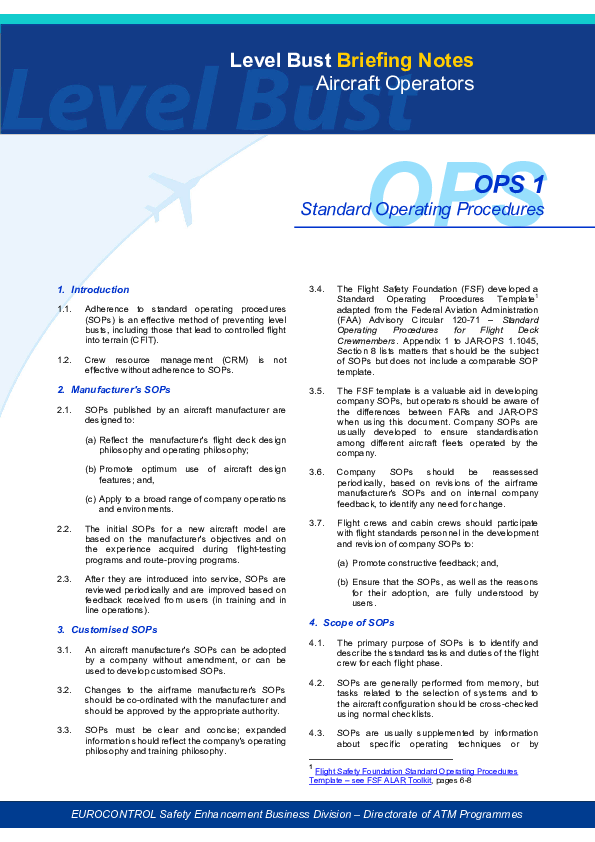 Adherence to standard operating procedures is an effective method of preventing level busts, including those that lead to ontrolled flight into terrain (CFIT). This briefing note addresses the construction of SOPs.
