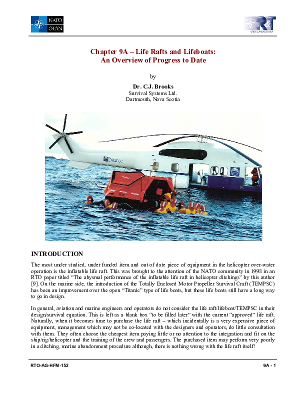 Life Rafts and Lifeboats: An Overview of Progress to Date, Chapter 9A of NATO RTO-AG-HFM-152