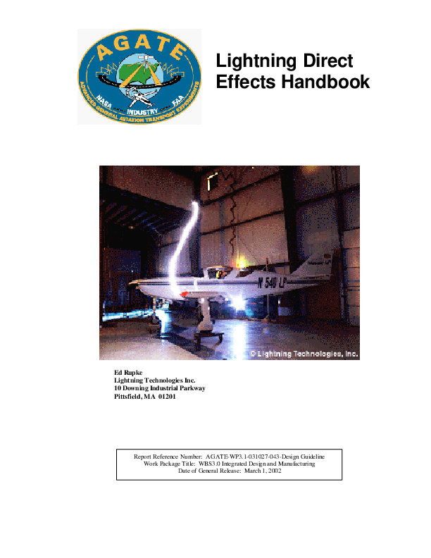 This handbook addresses the direct effects of lightning strikes. Its intent is to provide guidance and educate engineering personnel responsible for lightning protection of primary aircraft structure. The recommendations included in this document are specific to the design of small personal aircraft and may not be as applicable to large composite aircraft designs. It is intended to assist engineers with limited experience in the design of aircraft lightning strike protection. Information is included on the natural lightning environment, the interaction between aircraft and lightning, and the mechanism of the lightning strike effects on the aircraft.