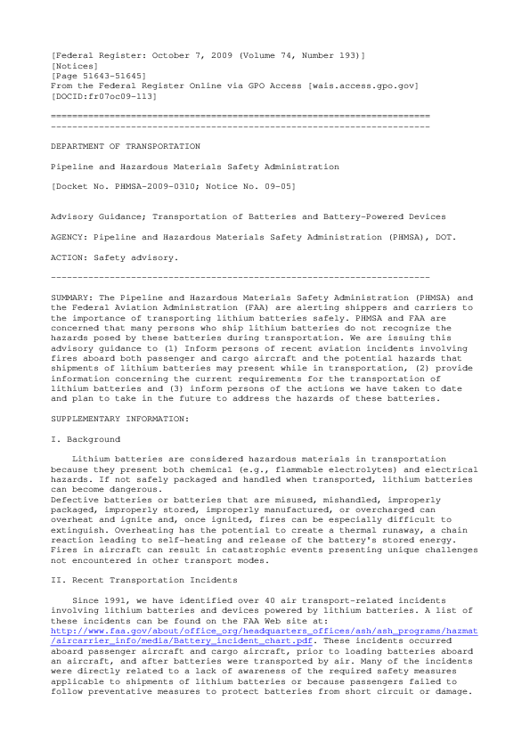 Desceribes the hazards associated with transportation of lithium batteries, incidents arising from incorrect transportation, and lists precaustions to be taken.