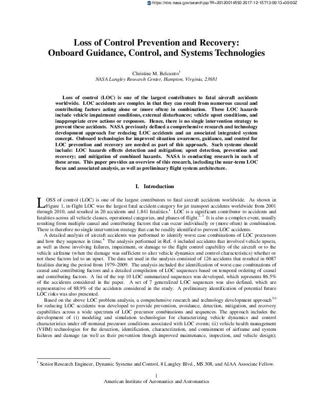 This paper provides an overview of the NASA research on: - LOC hazards effects detection and mitigation; - upset detection, prevention and recovery; - mitigation of combined hazards. The NASA research includes the near-term LOC focus and associated analysis, as well as preliminary flight system architecture.