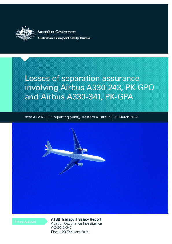On 31 March 2012, after the implementation of contingency ATC procedures for a period of 5 hours due to controller shortage, two Garuda A330 aircraft which had been transiting an associated Temporary Restricted Area (TRA) prior to re-entering controlled airspace were separately involved in losses of separation assurance, one when unexpectedly entering adjacent airspace from the TRA, the other when the TRA ceased and controlled airspace was restored. The Investigation did not find that any actual loss of separation had occurred but identified four Safety Issues in relation to the inadequate handling of the TRA activation by ANSP Airservices Australia.