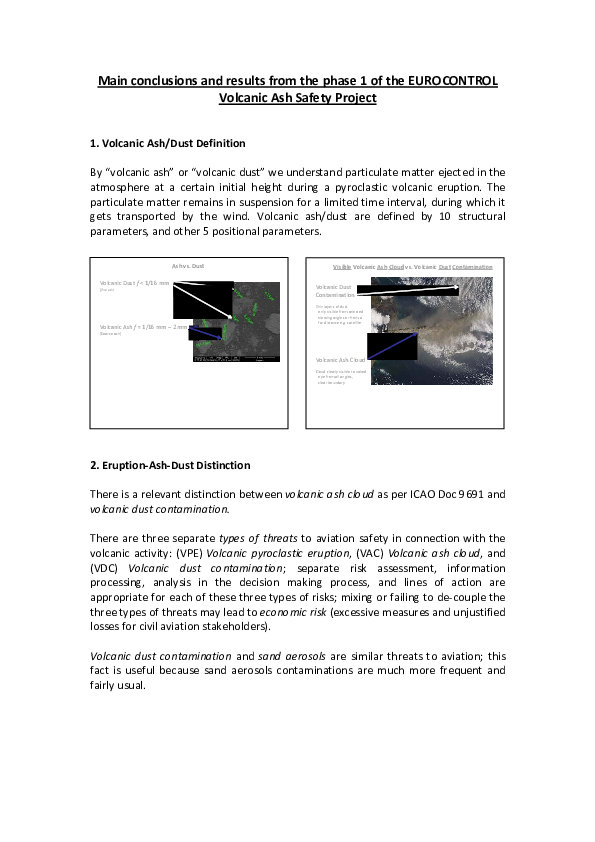 A brief summary of the conclusions and results of the phase 1 'Volcanic Ash Safety Project' by EUROCONTROL.